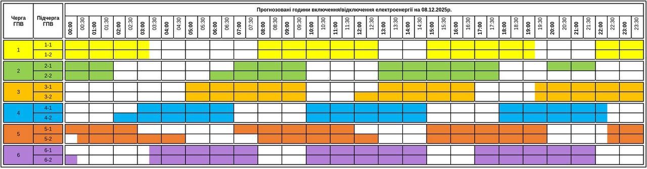 ⏳ Детальний графік ГПВ на 8 грудня 2025 року