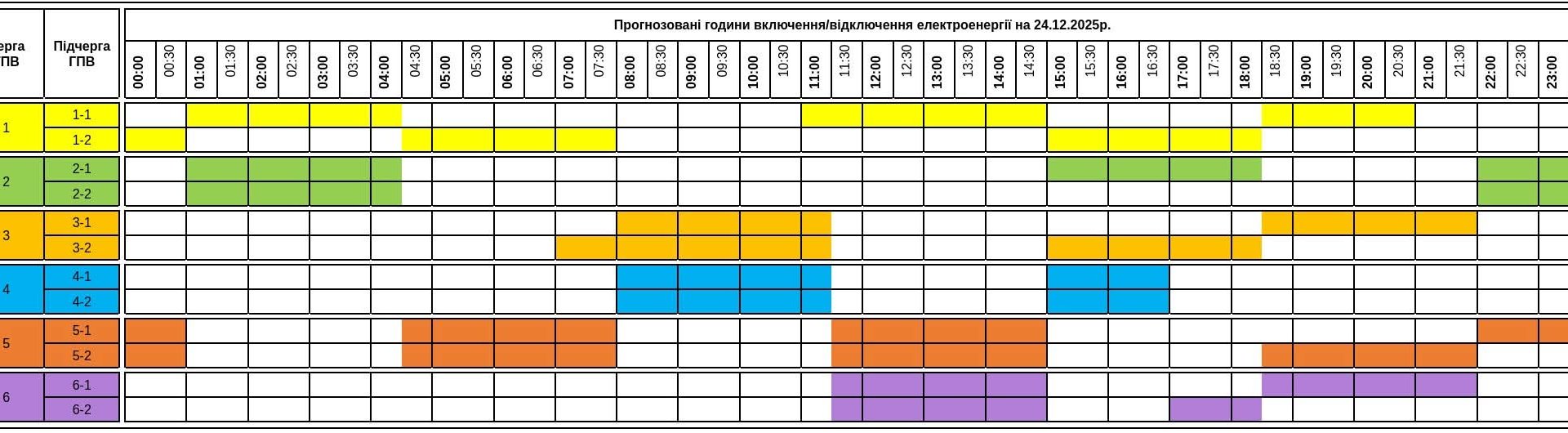 У середу, 24 грудня, на території Закарпатської області продовжують діяти графіки погодинних включень та відключень електроенергії. Обмеження запроваджені через пошкодження енергетичної інфраструктури внаслідок масованих атак ворога.