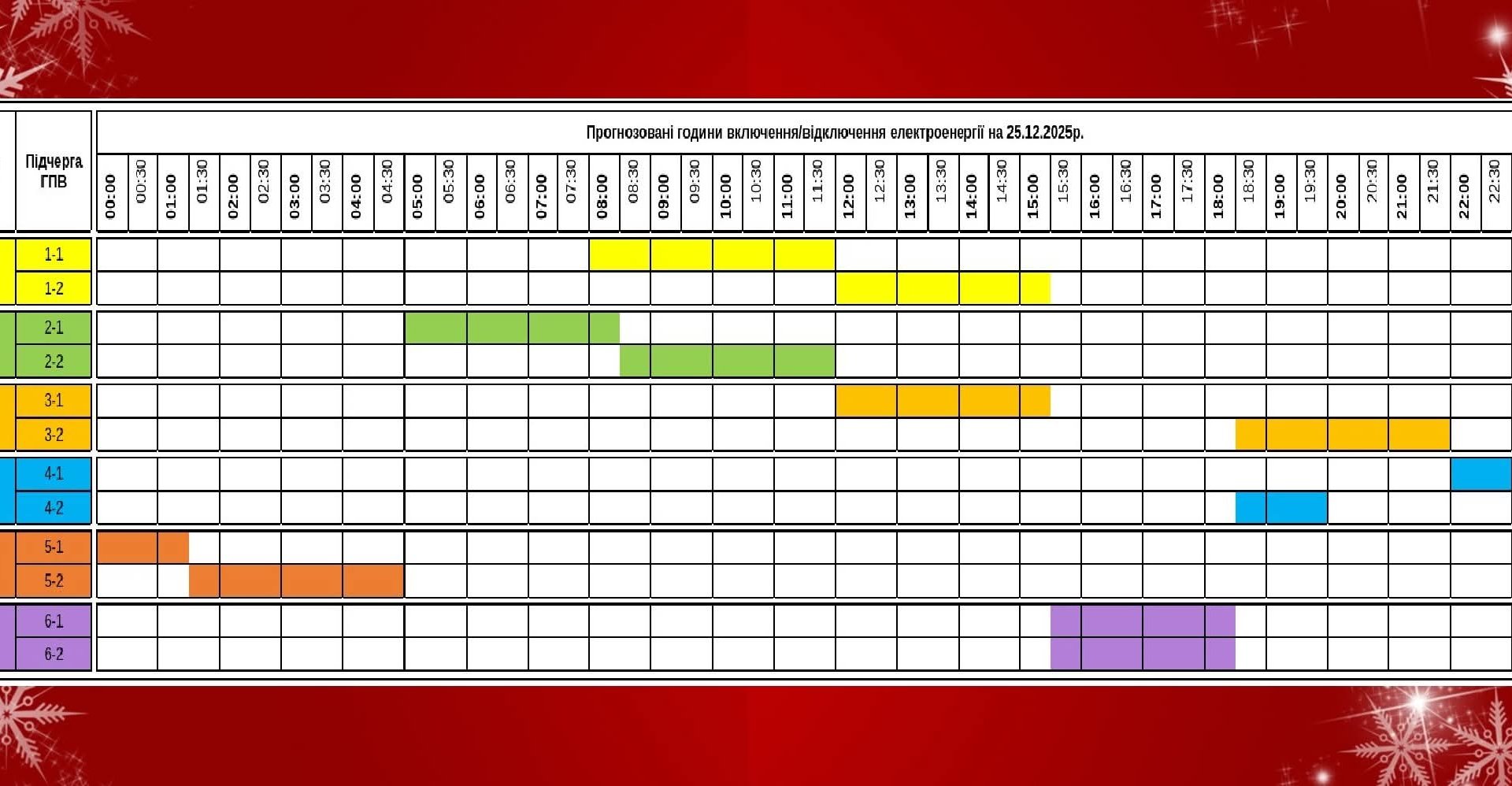 У четвер, 25 грудня, через наслідки масованих ракетно-дронових атак РФ на об'єкти енергетичної інфраструктури, в усіх регіонах України, зокрема і на Закарпатті, діятимуть графіки погодинних відключень (ГПВ).