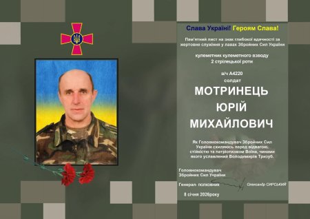 Сьогодні, 9 січня 2026 року, Дубівська громада прощатиметься зі своїм земляком, мужнім воїном Збройних Сил України — Мотринцем Юрієм Михайловичем.