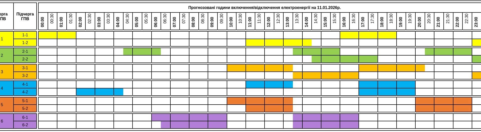 Графік погодинних відключень електроенергії на неділю, 11 січня 2026 року