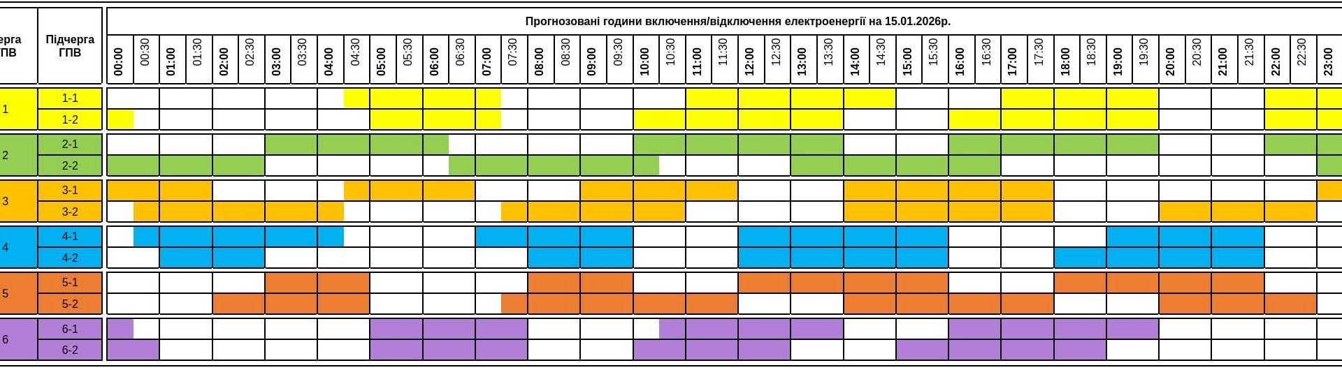 Через наслідки масованих атак на енергетичну інфраструктуру України, у четвер, 15 січня 2026 року, на території Закарпатської області продовжують діяти графіки погодинних обмежень електропостачання.