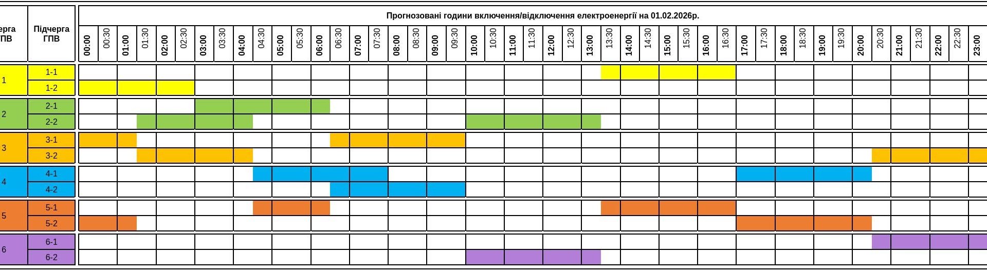 До уваги споживачів: у неділю, 1 лютого 2026 року, на Закарпатті діятиме графік погодинних включень та відключень електроенергії.