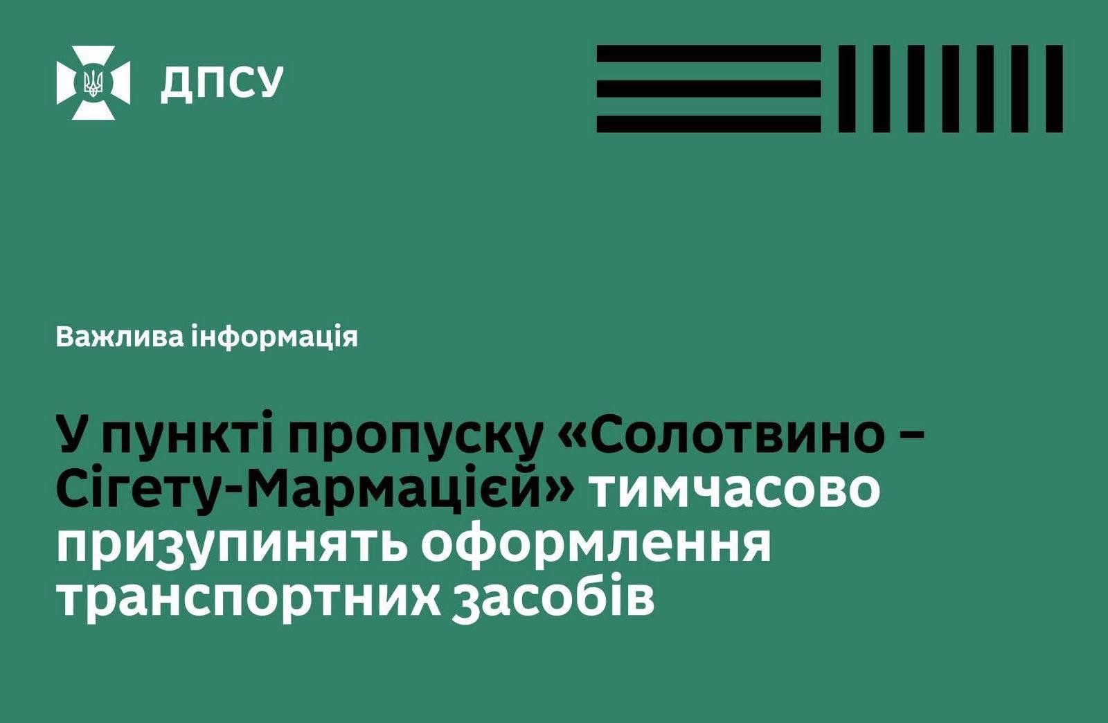 Повідомляємо, що з 16 лютого 2026 року запроваджується тимчасове обмеження руху транспортних засобів через пункт пропуску «Солотвино – Сігету-Мармацієй»