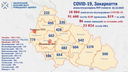 За інформацією відомства, загалом в області 10 004 закарпатцям встановлено діагноз COVID-19, із яких — 1018 медики та 561 — діти. За минулу добу одужали 233 закарпатці (загалом — 5 031). За добу, що минула, помер один хворий із встановленим діагнозом COVID-19 (загалом з початку пандемії — померли 309 пацієнтів з діагнозом COVID-19).
