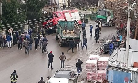Водій пожежного автомобіля, намагаючись уникнути зіткнення, зробив різкий маневр і після удару автомобіль не втримався на дорозі і перекинувся в кювет.