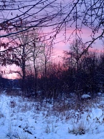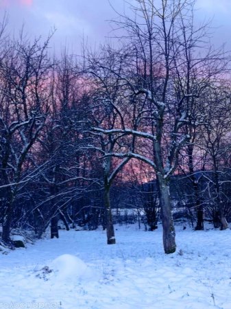 Магічна феєрія фіолетового заходу сонця відблискувала на сніжній ковдрі. До слова, білі мухи замели тамтешню глибинку із самого ранку.