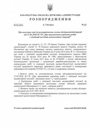 Голова ОДА Анатолій Полосков підписав розпорядження від 2 лютого 2021 року №69 "Про внесення змін до розпорядження голови облдержадміністрації від 27.03.2020 №178 "Про призначення керівника робіт з ліквідації наслідків надзвичайної ситуації".