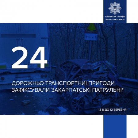 24 дорожньо-транспортні пригоди зафіксували патрульні на території обслуговування управління патрульної поліції Закарпатської області з 8 до 12 березня