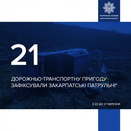 З 22 до 27 березня закарпатські патрульні зафіксували 21 дорожньо-транспортну пригоду