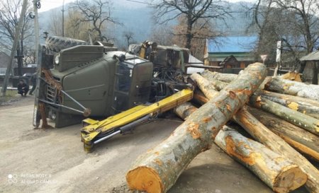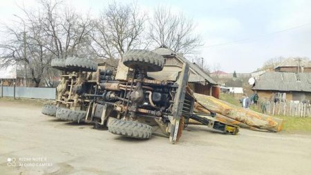 Лісовоз гружений деревиною зробив різкий поворот у результаті чого перекинувся і все дерево посипалось до приватного будинку де живе стара бабуся.