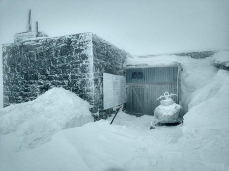 Станом на 10:00, 04.04.2021 на г. Піп Іван Чорногірський хмарно, туман (видимість до 30 м), вітер північний 10 м/с., температура повітря -10°С.