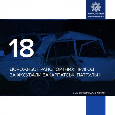 18 дорожньо-транспортних пригод зафіксували закарпатські патрульні за період з 29 березня до 3 квітня.
