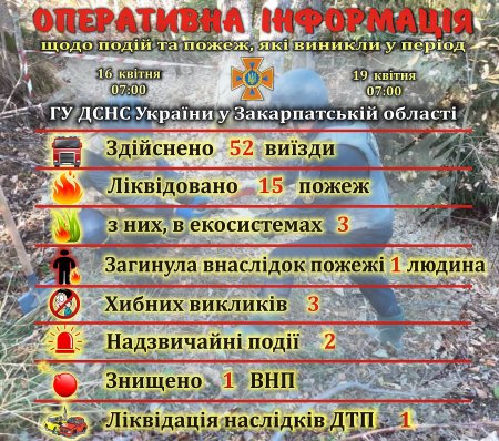 Підрозділами Головного управління ДСНС України у Закарпатській області впродовж 16-19 квітня для проведення заходів з попередження надзвичайних ситуацій, оперативного реагування на події та ліквідації їх наслідків, гасіння пожеж, проведення інших рятувальних заходів здійснено 52 виїзди, з яких три - хибні.