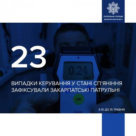 З 10 до 15 травня охоронці порядку виявили 23 випадки керування у нетверезому стані.