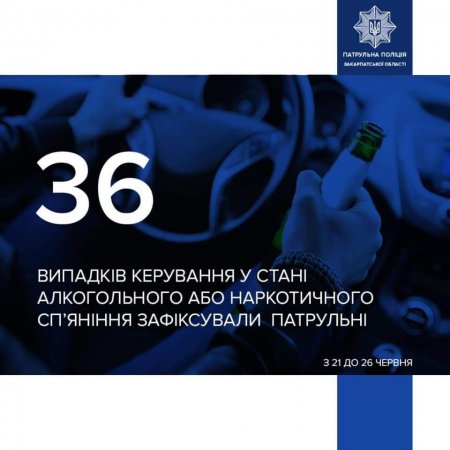 Впродовж тижня, з 21 до 26 червня патрульні склали 36 адмінпротоколів на водіїв, що керували у стані сп’яніння: