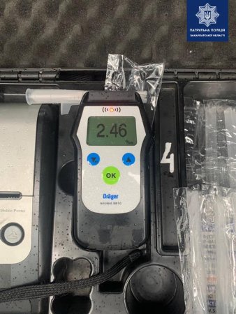 Під час перевірки документів у винуватця автопригоди інспектори помітили ознаки алкогольного сп’яніння. Огляд на стан сп’яніння керманич пройшов на місці за допомогою Драгера. Прилад показав 2,46 проміле.