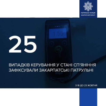 Протягом цього тижня, з 18 до 23 жовтня, закарпатські патрульні зафіксували 25 випадків керування у стані наркотичного або алкогольного сп‘яніння.