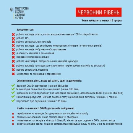 Нагадуємо, відсьогодні, 6 грудня, Постановою Кабінету Міністрів України посилено карантинні правила, зокрема для невакцинованих громадян.