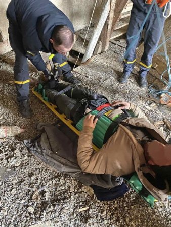 Потерпілого спускали донизу вертикально на мотузках, через вузькі отвори між вертикально встановленими драбинами. Попередній огляд травмованого, вказує на можливі ушкодження тазу та хребта.
