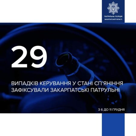 З 6 до 11 грудня закарпатські патрульні зафіксували 29 випадків керування у стані алкогольного або наркотичного сп'яніння