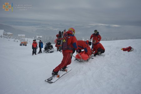 Після цього відбулася практична фаза, під час якої гірські рятувальники продемонстрували свою роботу та показали присутнім, як вони проводять пошуки людей, що потрапили під лавину, та надають домедичну допомогу туристам, які травмувалися під час катання на лижах. До навчань було залучено всюдихід Богун та снігохід Ямаха, котрий нещодавно придбали за рахунок обласного бюджету та передали для потреб Рахівської гірської пошуково-рятувальної групи.