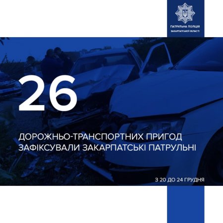 26 дорожньо-транспортних пригод зафіксували патрульні на території обслуговування управління патрульної поліції Закарпатської області з 20 до 24 грудня.