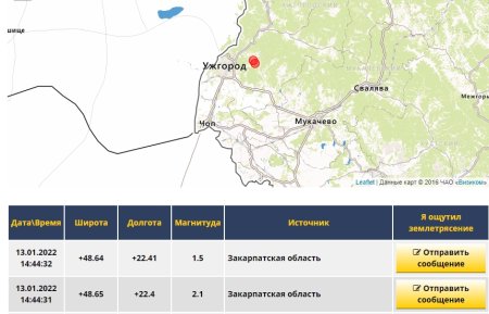 У Закарпатській області у четвер, 13 січня, стався землетрус. Про це свідчать дані Головного центру спеціального контролю.