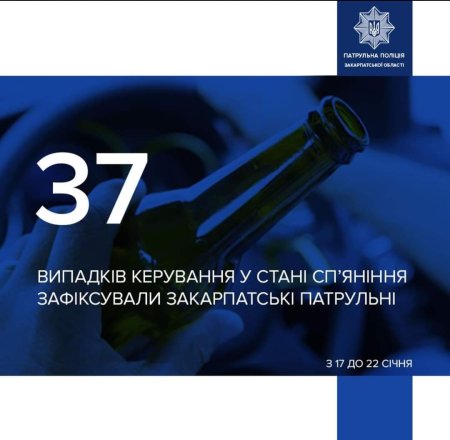 Протягом цього тижня, з 17 до 22 січня, закарпатські патрульні зафіксували 37 випадків керування у стані наркотичного або алкогольного сп‘яніння.