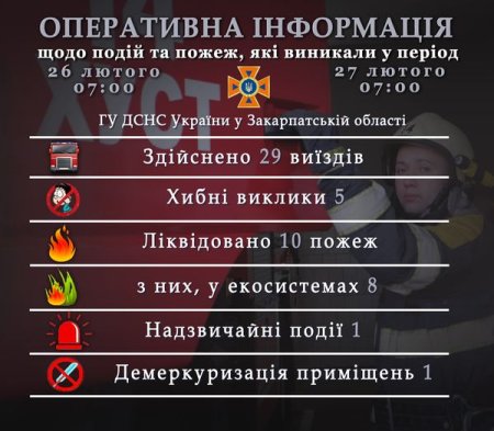 Підрозділами Головного управління ДСНС України у Закарпатській області впродовж чергової доби для проведення заходів з попередження надзвичайних ситуацій, оперативного реагування на події та ліквідації їх наслідків, гасіння пожеж, проведення інших рятувальних заходів здійснено 29 виїздів, із них 5 – хибні виклики.