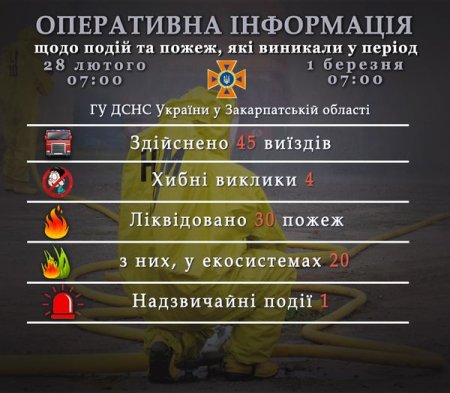 Підрозділами Головного управління ДСНС України у Закарпатській області впродовж чергової доби для проведення заходів з попередження надзвичайних ситуацій, оперативного реагування на події та ліквідації їх наслідків, гасіння пожеж, проведення інших рятувальних заходів здійснено 45 виїздів, із них 4 – хибні виклики.