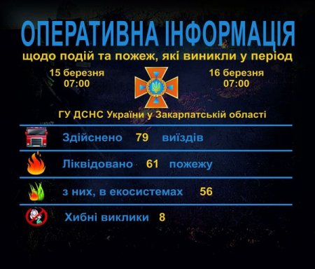 Підрозділами Головного управління ДСНС України у Закарпатській області впродовж чергової доби (станом на 𝟳:𝟬𝟬 16 березня) для проведення заходів з попередження надзвичайних ситуацій, оперативного реагування на події та ліквідації їх наслідків, гасіння пожеж, проведення інших рятувальних заходів здійснено 79 виїздів, із яких вісім – хибні.