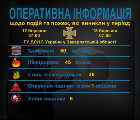 Підрозділами Головного управління ДСНС України у Закарпатській області впродовж чергової доби (станом на 𝟳:𝟬𝟬 18 березня) для проведення заходів з попередження надзвичайних ситуацій, оперативного реагування на події та ліквідації їх наслідків, гасіння пожеж, проведення інших рятувальних заходів здійснено 60 виїздів, із яких шість – хибні.