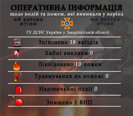Підрозділами Головного управління ДСНС України у Закарпатській області впродовж чергової доби (станом на 𝟳:𝟬𝟬 9 квітня) для проведення заходів з попередження надзвичайних ситуацій, оперативного реагування на події та ліквідації їх наслідків, гасіння пожеж, проведення інших рятувальних заходів здійснено 18 виїздів. Хибних викликів не зафіксовано.