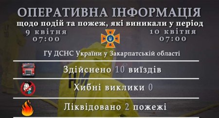 Підрозділами Головного управління ДСНС України у Закарпатській області впродовж чергової доби (станом на 𝟳:𝟬𝟬 10 квітня) для проведення заходів з попередження надзвичайних ситуацій, оперативного реагування на події та ліквідації їх наслідків, гасіння пожеж, проведення інших рятувальних заходів здійснено 𝟏0 виїздів. Хибних викликів не зареєстровано.