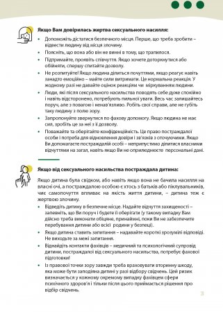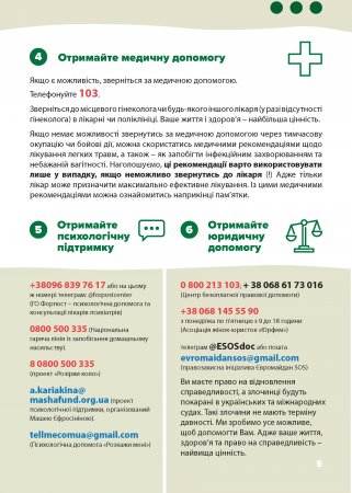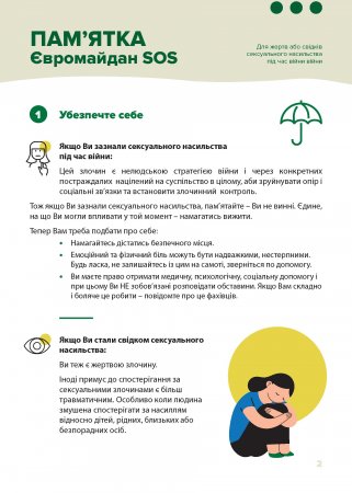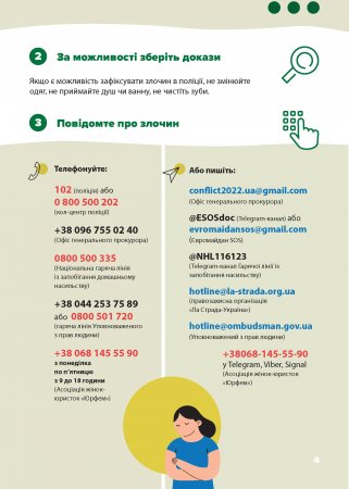 Якщо ви чи ваші близькі (жінки, чоловіки, діти) стали жертвою сексуального насильства під час війни або стали свідками такого злочину, нижче покроковий супровід, що можна зробити.