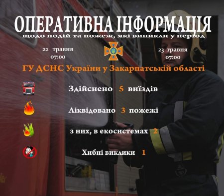 Підрозділами Головного управління ДСНС України у Закарпатській області впродовж чергової доби (станом на 𝟳:𝟬𝟬 𝟐𝟑 травня) для проведення заходів з попередження надзвичайних ситуацій, оперативного реагування на події та ліквідації їх наслідків, гасіння пожеж, проведення інших рятувальних заходів здійснено 𝟓 виїздів, з яких один - хибний.