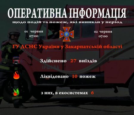Підрозділами Головного управління ДСНС України у Закарпатській області впродовж чергової доби (станом на 𝟳:𝟬𝟬 𝟬𝟮 червня) для проведення заходів з попередження надзвичайних ситуацій, оперативного реагування на події та ліквідації їх наслідків, гасіння пожеж, проведення інших рятувальних заходів здійснено 27 виїздів. Хибних викликів не зафіксовано.