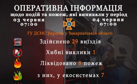 Підрозділами Головного управління ДСНС України у Закарпатській області впродовж чергової доби станом на 𝟳:𝟬𝟬 04 червня) для проведення заходів з попередження надзвичайних ситуацій, оперативного реагування на події та ліквідації їх наслідків, гасіння пожеж, проведення інших рятувальних заходів здійснено 29 виїздів, з яких один-хибний.