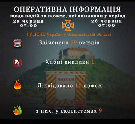 Підрозділами Головного управління ДСНС України у Закарпатській області впродовж чергової доби станом на 𝟳:𝟬𝟬 𝟐𝟔 червня для проведення заходів з попередження надзвичайних ситуацій, оперативного реагування на події та ліквідації їх наслідків, гасіння пожеж, проведення інших рятувальних заходів здійснено 𝟐𝟗 виїздів, з яких 𝟏 – хибний.