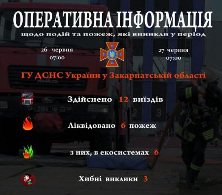 Підрозділами Головного управління ДСНС України у Закарпатській області впродовж чергової доби станом на 𝟳:𝟬𝟬 27 червня для проведення заходів з попередження надзвичайних ситуацій, оперативного реагування на події та ліквідації їх наслідків, гасіння пожеж, проведення інших рятувальних заходів здійснено 12 виїздів, з яких три – хибні.