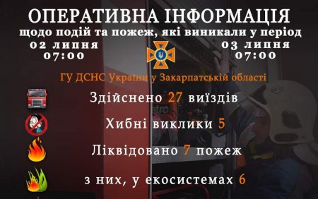 Підрозділами Головного управління ДСНС України у Закарпатській області впродовж чергової доби станом на 𝟳:𝟬𝟬 3 липня для проведення заходів з попередження надзвичайних ситуацій, оперативного реагування на події та ліквідації їх наслідків, гасіння пожеж, проведення інших рятувальних заходів здійснено 27 виїздів, з яких 𝟓 виявились хибними.
