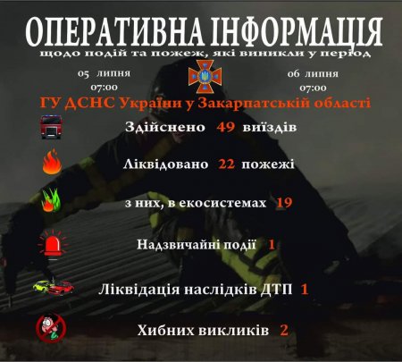 Підрозділами Головного управління ДСНС України у Закарпатській області впродовж чергової доби станом на 𝟳:𝟬𝟬 𝟎𝟔 липня для проведення заходів з попередження надзвичайних ситуацій, оперативного реагування на події та ліквідації їх наслідків, гасіння пожеж, проведення інших рятувальних заходів здійснено 𝟒𝟗 виїздів, з яких два - хибні.