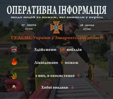 Підрозділами Головного управління ДСНС України у Закарпатській області впродовж чергової доби станом на 𝟳:𝟬𝟬 𝟖 липня для проведення заходів з попередження надзвичайних ситуацій, оперативного реагування на події та ліквідації їх наслідків, гасіння пожеж, проведення інших рятувальних заходів здійснено 𝟏𝟗 виїздів, з яких один - хибний.