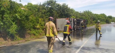 Сьогодні берегівським #рятувальникам довелося відчищати близько 30 метрів автошляху від олії. Їм допомагали й дорожники.