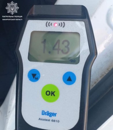Під час перевірки документів у винуватця автопригоди патрульні помітили ознаки алкогольного сп’яніння. Водій погодився пройти огляд на стан сп‘яніння на місці за допомогою Драгера. Прилад показав 1,43 промілле, що у 7 разів перевищує допустиму норму.