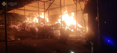 На Берегівщині через пожежу постраждали одразу два обійстя🔥. Подія трапилася сьогодні вночі в с. Великі Ком'яти. Власниця господарства вже лягла спати, але прокинулася від звуку горіння й побачила, що полум’я охопило її навіс із сіном і перекинулося на літню кухню й сусідський сарай. Рятувальникам із Виноградова та Іршави знадобилося 2,5 години, аби ліквідувати загорання на площі 80 кв.м. Вогонь знищив навіс, крівлю літньої кухні, 1,5 тонни сіна власниці, а також крівлю та перекриття сараю, 0,15 тонни соломи її сусідки.