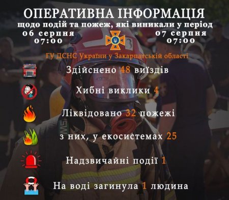 Підрозділами Головного управління ДСНС України у Закарпатській області впродовж чергової доби станом на 𝟳:𝟬𝟬 𝟎𝟕 серпня для проведення заходів з попередження надзвичайних ситуацій, оперативного реагування на події та ліквідації їх наслідків, гасіння пожеж, проведення інших рятувальних заходів здійснено 𝟒𝟖 виїздів, з яких 𝟒 - хибні.