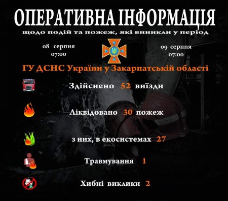Підрозділами Головного управління ДСНС України у Закарпатській області впродовж чергової доби станом на 𝟳:𝟬𝟬 𝟎𝟗 серпня для проведення заходів з попередження надзвичайних ситуацій, оперативного реагування на події та ліквідації їх наслідків, гасіння пожеж, проведення інших рятувальних заходів здійснено 𝟓𝟐 виїзди, з яких два - хибні.