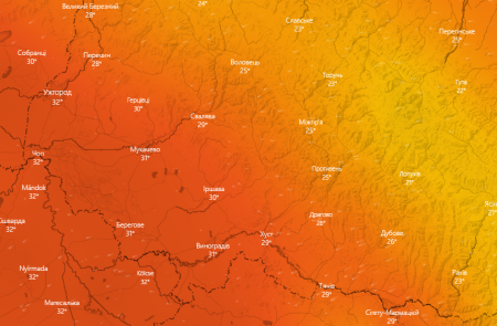 Сьогодні, в згідно останніх даних метеосупутників погоди в низинних районах Закарпаття температура повітря підніметься до позначки +32 градуси, в гірських до +23 градуси, дощ не передбачається.